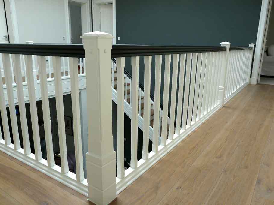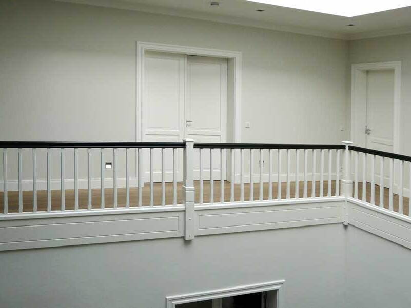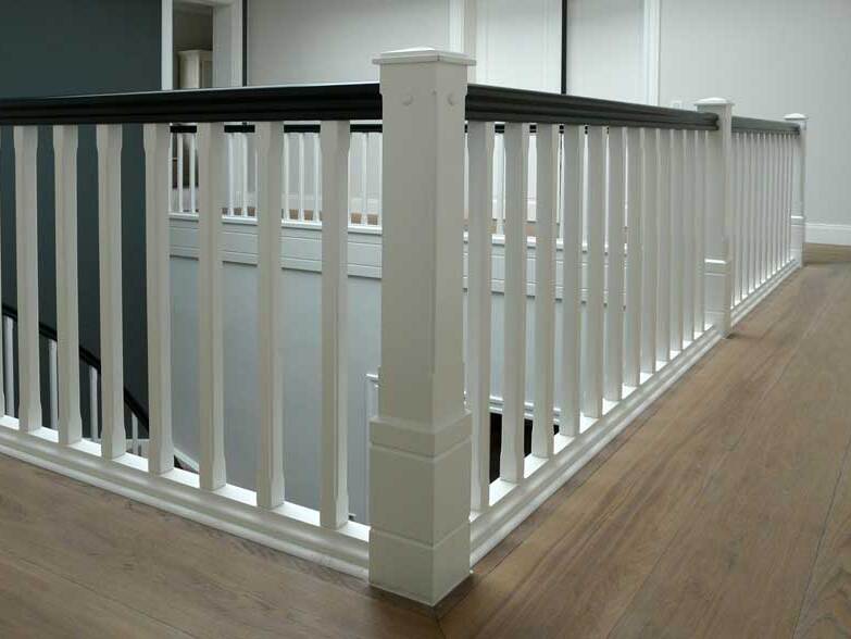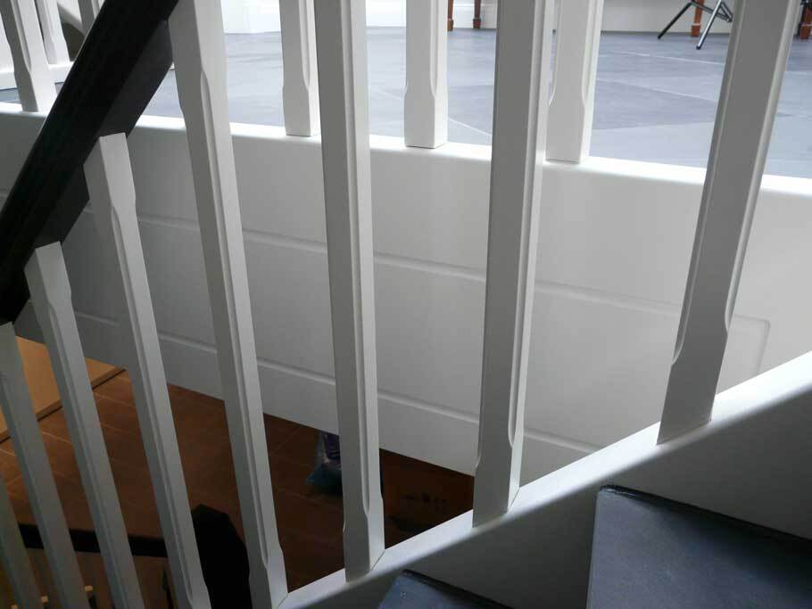 - Wangen, Setzstufen, Stäbe und Pfosten in weiß endlackiert