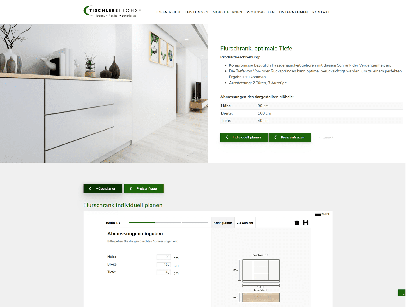Darüber hinaus können Sie nun mit dem Online-Möbelplaner viel anschaulicher einen Schrank oder ein Regal planen. Sie wählen in Schritt 1 das Möbel aus, konfigurieren dies in Schritt 2 selbst und lassen es in Schritt 3 von uns als Tischler anfertigen. Gerne können Sie die vielen Beispiele auch als Anregung nehmen und eigene Ideen bei uns anfragen. Rufen Sie uns einfach an unter 04193 95307.