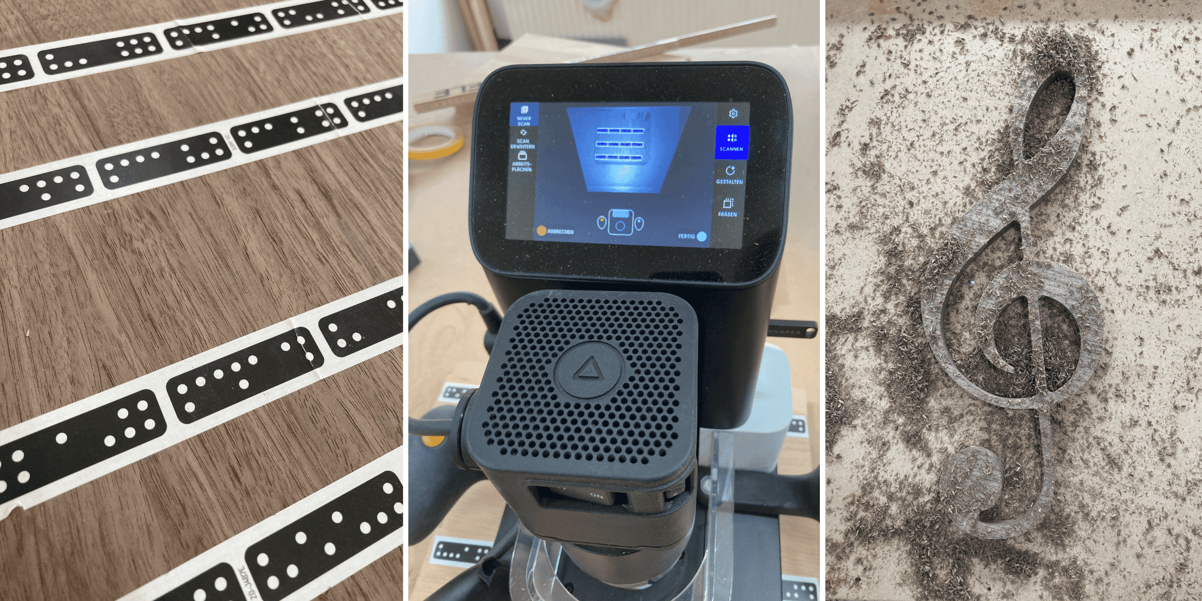 Damit die Oberfräse von Shaper Tools überhaupt anfangen kann zu fräsen, muss die Maschine Markierungen erkennen. Dies sind keine mit einem Bleistift, sondern schwarze Rechtecke mit weißen Kreisen. Wenn die handgeführte CNC den ebenen Untergrund gescannt hat, kann das auszufräsende Objekt auf dem Werkstück virtuell platziert werden. Die Ausrichtung und Größe wird ebenfalls angepasst. Anschließend wird das Objekt ausgefräst (hier ein Notenschlüssel).